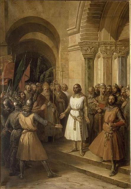 Painting of St. Boniface establishing the four ancient Bavarian dioceses, pointing them out to the various Bishops and Abbot.