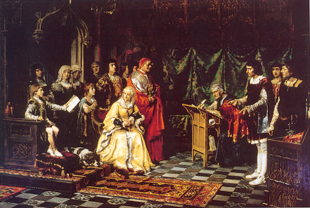 While they were carrying on the war against Granada Christopher Columbus presented himself to the Catholic sovereigns, and to Queen Isabella fell the honour of appreciating the genius who had not been understood at Genoa, at Venice, or in Portugal. Protected first of all by the Spanish friars, he was presented to the queen by her confessor, Padre Hernando Talavera, and Cardinal Mendoza (el Cardenal de España); and with the means which the king and queen procured for him he fitted out the three famous caravels which placed America in communication with the Old World. Sailing, 3 August, 1492, from the port of Palos, he discovered on 12 October – the day on which the feast of Our Lady of the Pillar is observed in Spain – the first of the Bahama Islands.