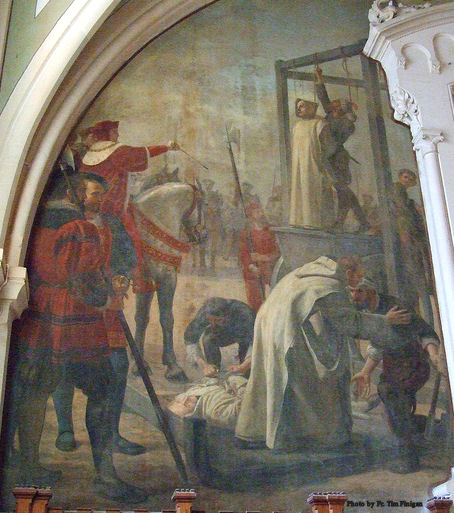 Chapter House at Parkminster has several paintings of the sufferings of the English Carthusian martyrs. This painting shows one monk hanging while another forgives the man who is about to execute him.