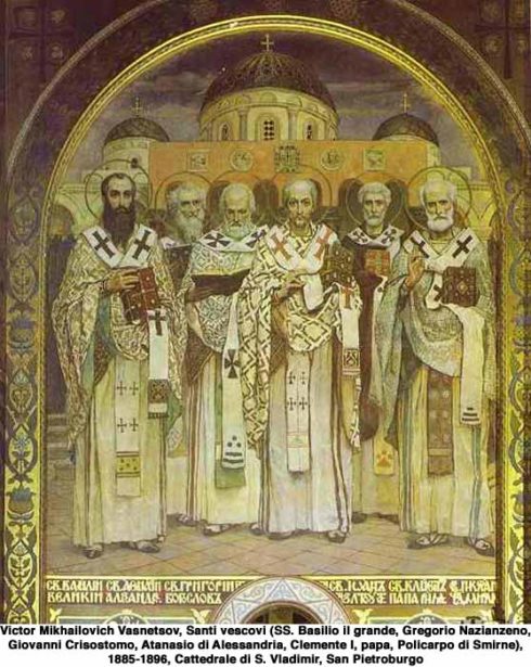 L to R: St. Basil, St. Gregory of Nazianzus, St. John Chrysostom, St. Athanasius of Alexandria, Pope St. Clement I, St. Polycarp of Smyrna. Painting (Icon) by by Viktor Vasnetsov