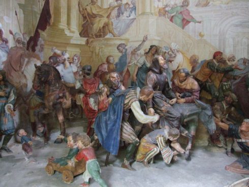 Not long after his return to Assisi, whilst Francis was praying before an ancient crucifix in the forsaken wayside chapel of St. Damian’s below the town, he heard a voice saying: “Go, Francis, and repair my house, which as you see is falling into ruin.” Taking this behest literally, as referring to the ruinous church wherein he knelt, Francis went to his father’s shop, impulsively bundled together a load of colored drapery, and mounting his horse hastened to Foligno, then a mart of some importance, and there sold both horse and stuff to procure the money needful for the restoration of St. Damian’s. When, however, the poor priest who officiated there refused to receive the gold thus gotten, Francis flung it from him disdainfully. The elder Bernardone, a most niggardly man, was incensed beyond measure at his son’s conduct, and Francis, to avert his father’s wrath, hid himself in a cave near St. Damian’s for a whole month. When he emerged from this place of concealment and returned to the town, emaciated with hunger and squalid with dirt, Francis was followed by a hooting rabble, pelted with mud and stones, and otherwise mocked as a madman. Finally, he was dragged home by his father, beaten, bound, and locked in a dark closet.