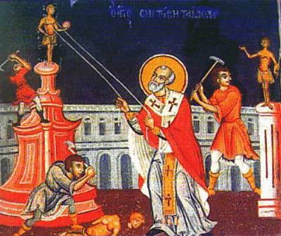 St. Aemilianus destroyed many pagan idols and temples. Here he is shown using ropes to pull down a pagan idol, while his followers are breaking them up with picks and axes.