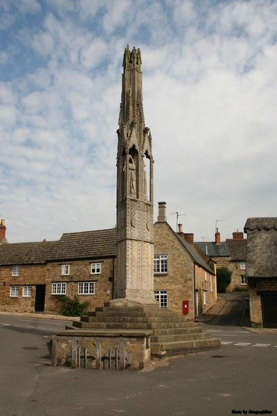 Relic from times of faith ― the Geddington Cross, one of twelve, was erected by Edward I to mark the overnight resting places of the funeral cortege of his deceased queen, Eleanor of Castile (d. 1290) in its journey from Lincoln to Westminster Abbey.