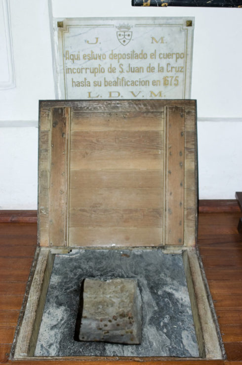 The tomb of St. John of the Cross, suspended high above the side chapel’s altar by four pillars. There are two altars on either side of the tomb so two priests can say Mass simultaneously.