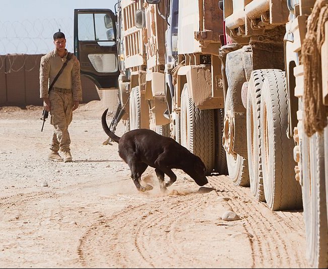 U.S. Marine Corps Lance Cpl. Adam Fox, an infantryman and dog handler with 1st Battalion, 25th Marine Regiment, supervises Cpl. Jett, an IED detection dog, while he sniffs for explosives at Camp Dwyer, Afghanistan, Oct. 23, 2011. Jett, a chocolate Labrador retriever, and Fox work together to protect Marines at their post from IED threats. The IED detection team spends up to 35 hours a week on various drills, honing their communications skills and Jett’s detection abilities.