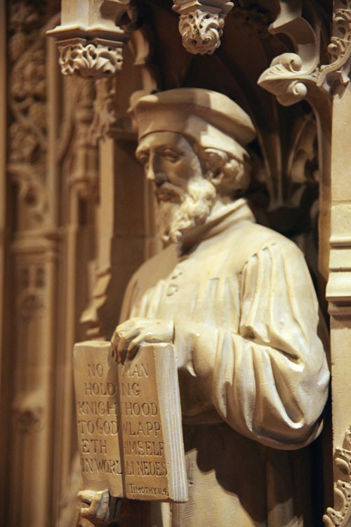 Closeup of Cardinal Stephen Langton statue on the Canterbury Pulpit at Washington National Cathedral in Washington, D.C. Photo by Tim Evanson.
