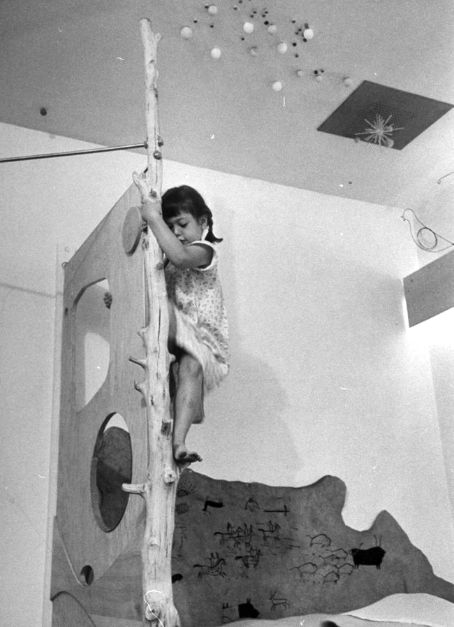 This picture gives an example of this. It is a girl’s playroom. Embedded in the wall is something resembling a rock of rude and irregular contour. On it are some pseudo-infantile figures that, in fact, resemble art figures of primitive man. It seems to be a part of a prehistoric cave and is used to create an environment which is inherent to it. And this environment can already be seen in this little world where this girl’s soul is to be formed. To the side is a picture of an amusement that cave children must have had when they were able to leave their cave to play a bit—a tree to climb. There is a dried trunk, upon which the girl can climb up and down to her heart’s content. Next to the trunk is a board with large asymmetrical holes to give some diversity to the amusement. The girl can squirm through the holes if perchance she finds going up and down the trunk becomes monotonous. And there is a third amusement: the girl can fling herself on the ground, happily substituted, in this case, by a mattress. (Even modern pedagogy is still somewhat bourgeois.) Yet another pastime that a prehistoric child would have enjoyed!