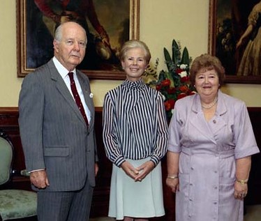 Katharine, Duchess of Kent, center. HRH Duchess of Kent with Sir Walter Campbell, Governor of Queensland, and Lady Campbell at Government House, Brisbane, March 5, 1992.